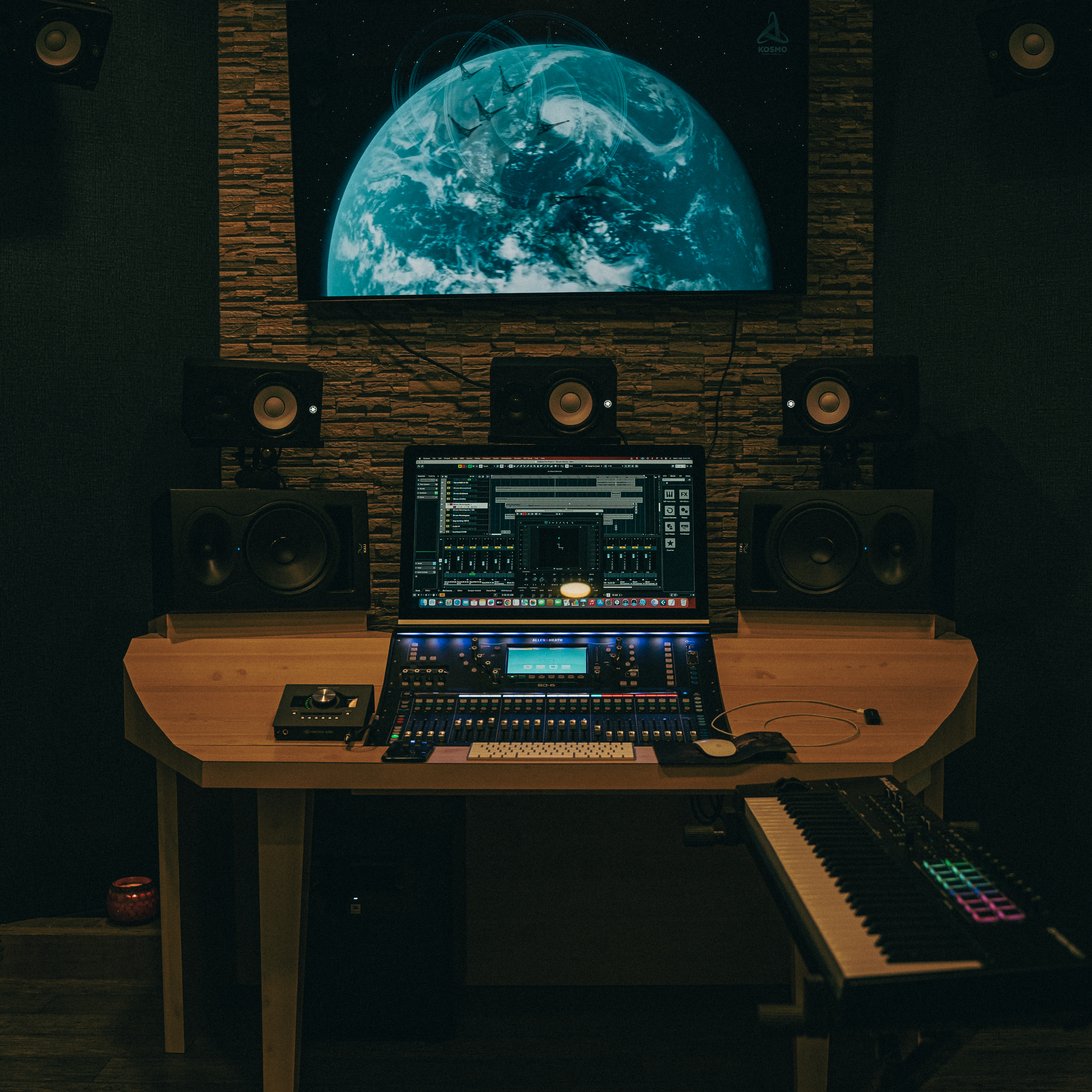 The nerve center of our studio — equipped with high-end monitors, analog outboard gear, and a Dolby Atmos speaker array.